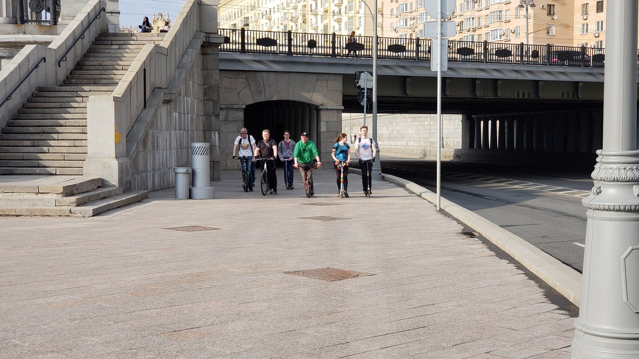 Переход через мост «Багратион» – и мы в Сити. Привычным маршрутом по набережным мы добрались до Лужников, перешли на другую стороны Москвы-реки, прокатились вдоль Нескучного сада и Парка Горького, финишировав в парке искусств «Музеон».